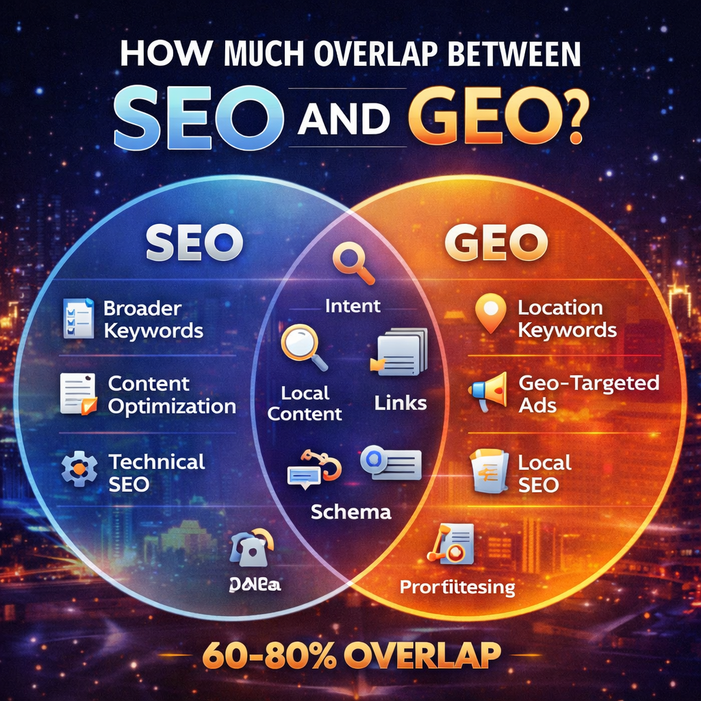 The overlap between SEO and GEO is substantial—often estimated at 60–80%, depending on the business type. For local businesses, the overlap is even higher because most of their visibility depends on location-driven searches.